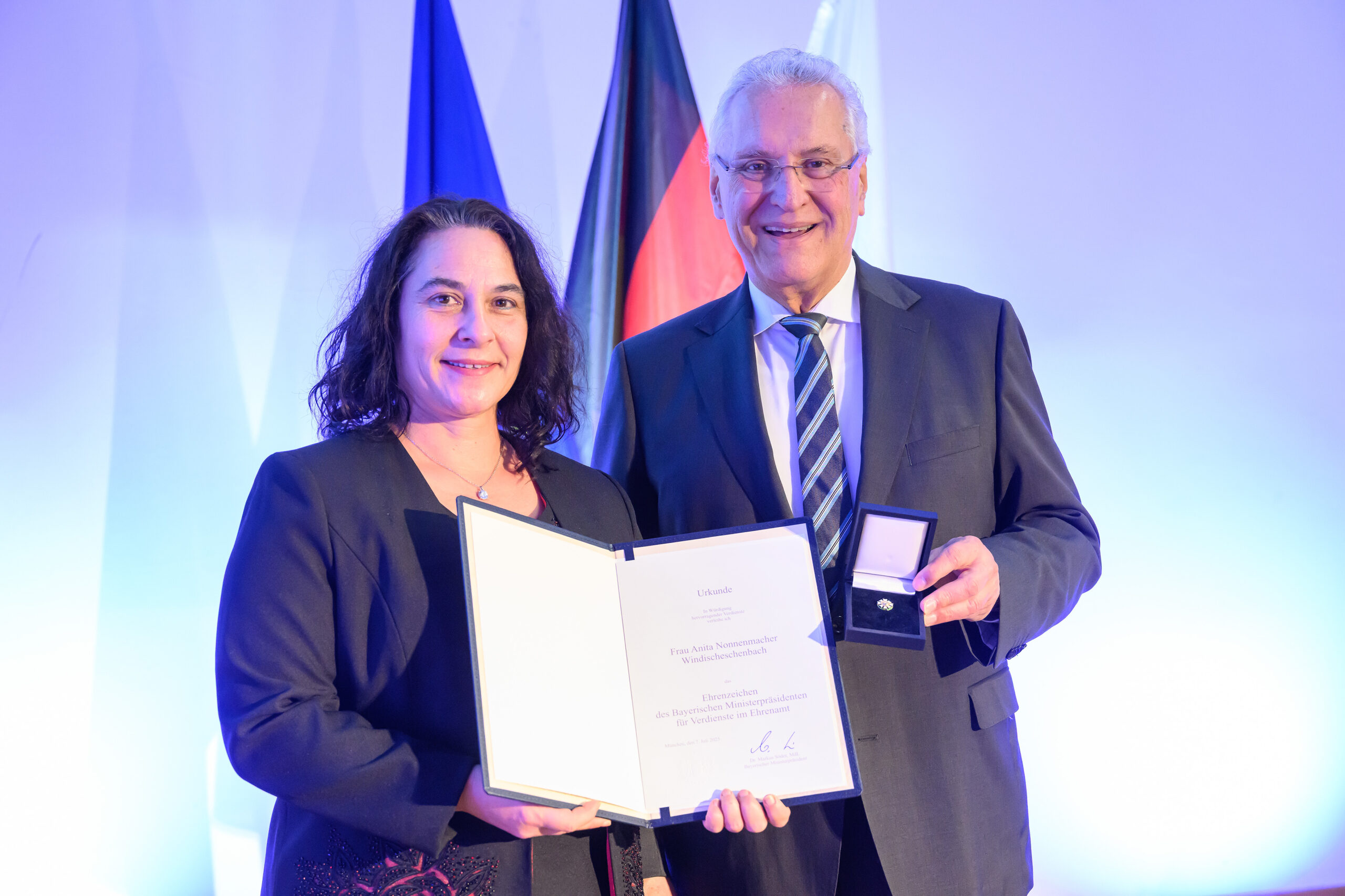Am 31. Oktober 2025 wurden Frau Anita Nonnenmacher und Herr Ferdinand Schönberger für ihr herausragendes ehrenamtliches Engagement mit dem Ehrenzeichen des Bayerischen Ministerpräsidenten für Verdienste im Ehrenamt geehrt. Die feierliche Verleihung nahm Herr Staatsminister Joachim Herrmann persönlich vor.